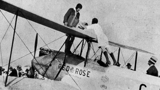 Bill Lancaster, with Jessie ‘Chubbie’ Miller, after the pair arrived in Darwin on March 19, 1928, having flown from England to Australia. The flight took 159 days. Picture: AP Photo